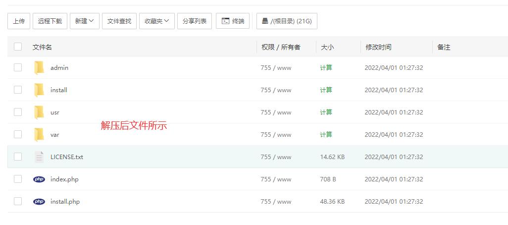 把该目录中的现有文件全部删除。然后把 Typecho 文件压缩包上传到网站目录中并解压,解压后就可以删除Typecho压缩包了。